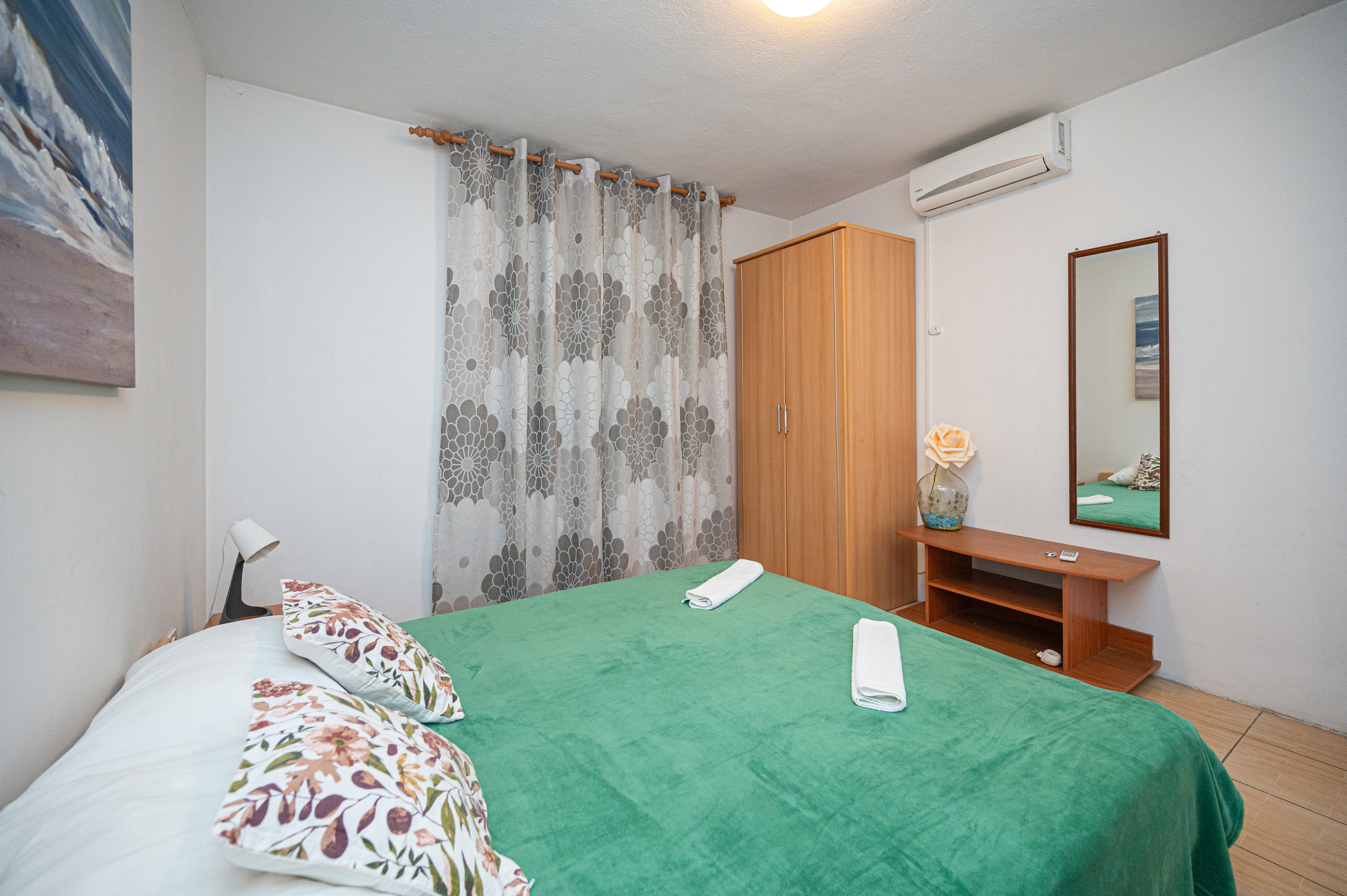 Studio flat can accommodate 5 guests. Beds are situated in 2 sleeping rooms, but also in the living room, within 28m2. Guests can use a private terrace to enjoy the warm summer evenings. Food can be prepared using barbecue which is shared with other guests too. This accommodation unit welcomes pets at an additional charge. INCLUDED IN THE PRICE: tourist tax, final cleaning, air-conditioning, parking, internet, baby cot, iron, ironing board, hairdryer. OBLIGATORY ADDITIONAL COSTS: short stay fee (surcharge depending on a number of booked nights: 30% - 1, 20% - 2, 10% - 3). OPTIONAL ADDITIONAL COSTS: pets (€5.00 per night). The availability of additional services for your chosen dates of stay, as well as their prices (if none are listed) must be checked ahead of time. Any additional services not shown in the price calculation are payable directly to the property owner and only if used by the visitor.