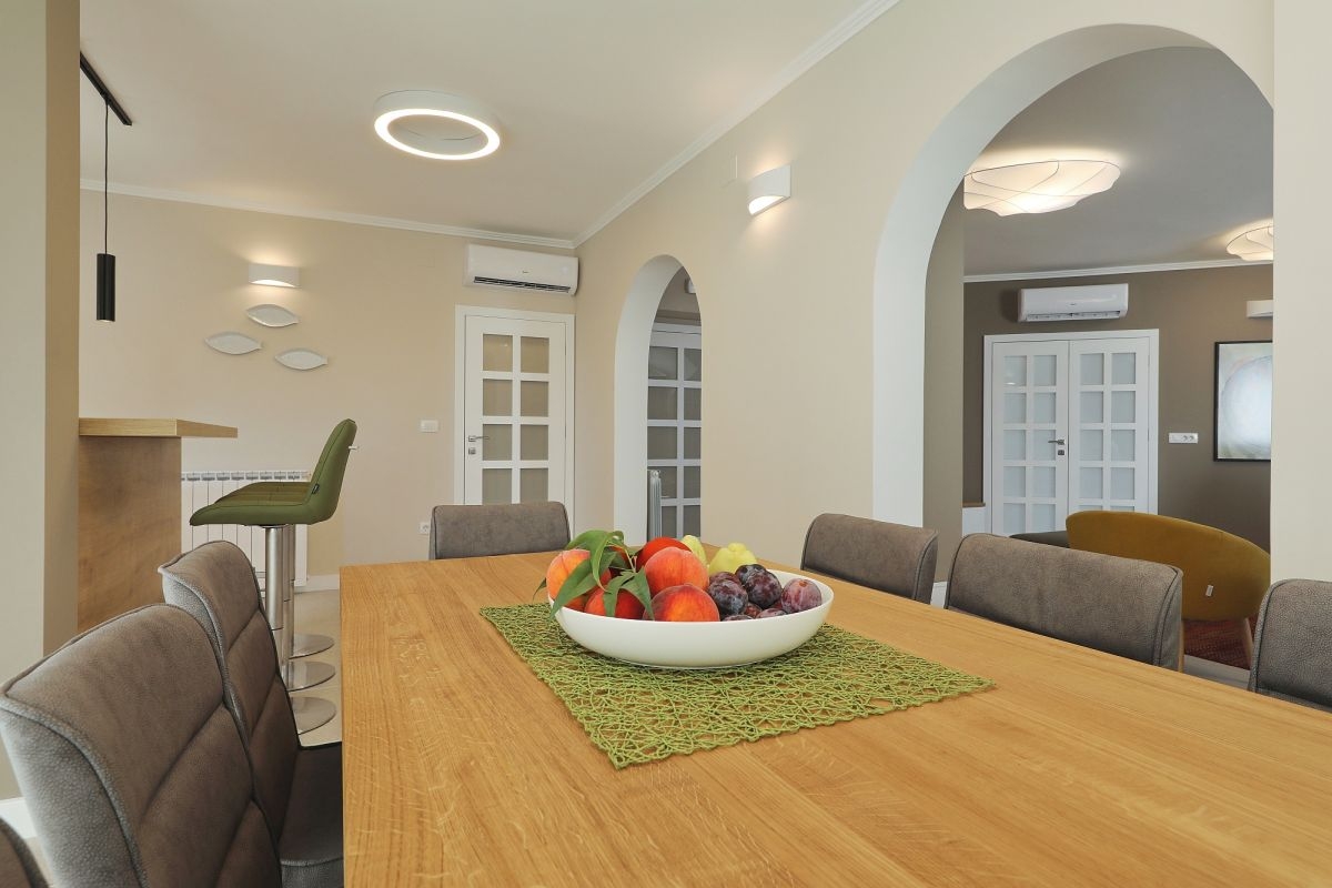 House can accommodate 12 guests. Beds are situated in 6 sleeping rooms, within 221m2. Guests can use a private terrace to enjoy the warm summer evenings. For full enjoyment and relaxation there is a private barbecue for this accommodation guests only. During stay, there is a private pool for relaxation and pleasure. Notthe rooms of the booked accommodation unit are connectedone whole. INCLUDED IN THE PRICE: tourist tax, final cleaning, air-conditioning, central heating, pool, parking, internet, baby cot, iron, ironing board, hairdryer. OBLIGATORY ADDITIONAL COSTS: short stay fee (surcharge depending on a number of booked nights: 30% - 1, 20% - 2, 10% - 3). The availability of additional services for your chosen dates of stay, as well as their prices (if none are listed) must be checked ahead of time. Any additional services not shown in the price calculation are payable directly to the property owner and only if used by the visitor. Discounts to the base price: free day 14=13 (for reservations of 14 or more days you get one free day for the stay until 31122026).